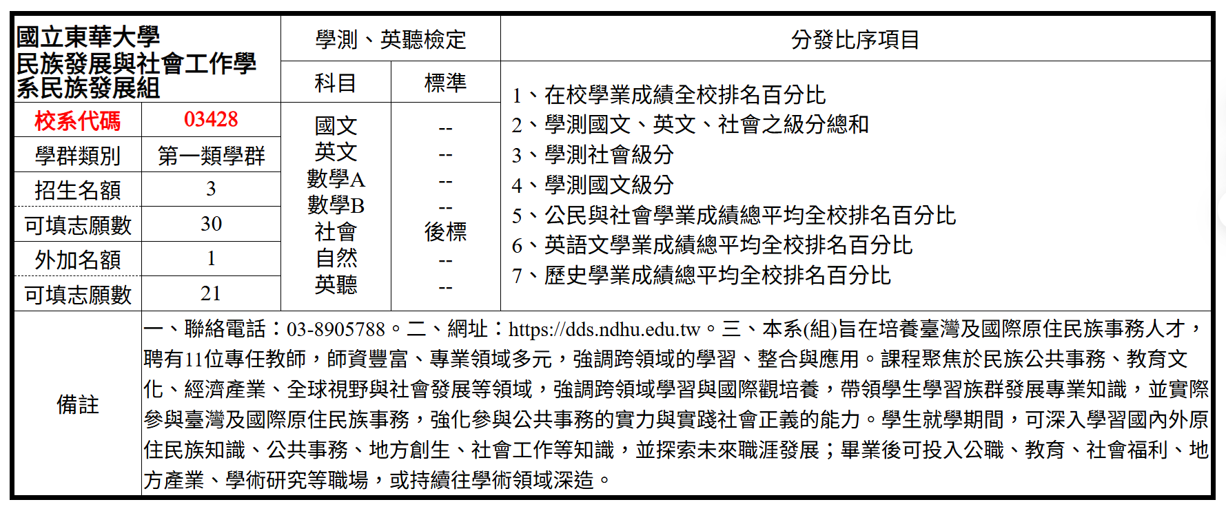 民族發展組:3 名(另有原住民族外加名額 1 名)
